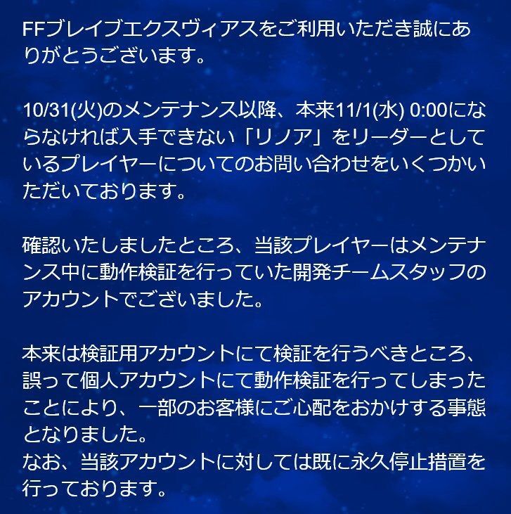 実装前にリノアをフレンドが利用できる枠に置いていたプレイヤーがいた。というやらかしがあった