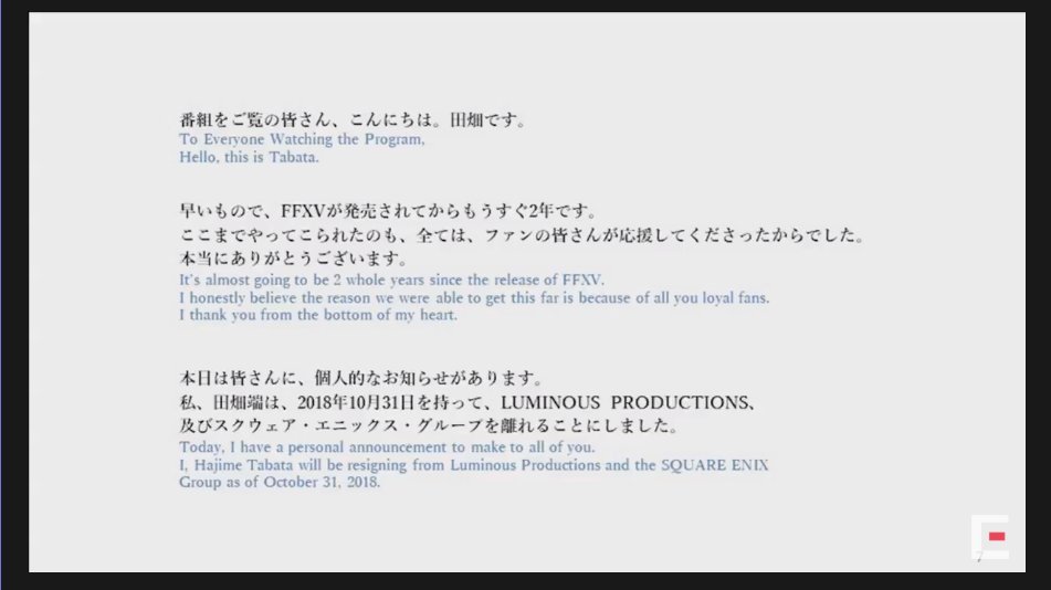 元々のルミナス名乗ってたチームも解散してそこのメインメンバー退職、FF15のリードプログラマ退職で、タバティスまで去ったとなると、FFのノウハウ担ってたメンバーバッサリやな